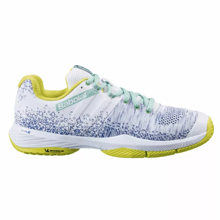 Babolat bringer dig her en dame padel sko som udover at indeholde fede teknologier, samtidig har fået et skarpt look så du kan gå på banen med stil. Skoen kommer i et friskt, lyst design med fede detaljer i både grøn, blå og hvid.