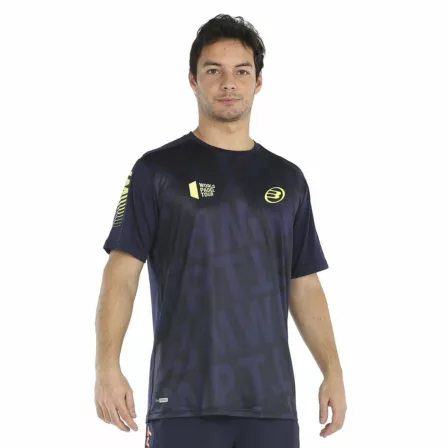 Poloen er i en flot navy blå. På skulderne er der logo for World Padel Tour i en flot frisk gul farve. Den samme gule farve er blevet brugt på logoet for Bullpadel på brystet.