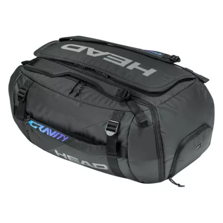 Head præsenterer her deres Gravity Duffle Bag i en sort farve med en lækker lilla farve indvendig. En stilren taske til tennis fyldt med kvalitetsmaterialer, som er med til at øge holdbarheden af tasken.