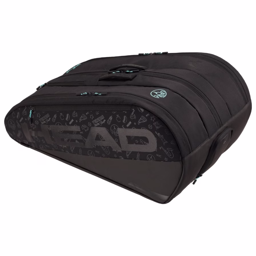 Denne tennistaske er skabt til spilleren, der ønsker både kapacitet, funktionalitet og et iøjnefaldende design. Den har et livligt neon-look inspireret af New Yorks skyline, frihedsgudinden, ikoniske gule taxaer og endda en pizzaskive – alt sammen kombineret med reflekterende detaljer, der gør dig synlig efter mørkets frembrud. Indvendigt finder du et lyseblåt for med samme mønster som ydersiden. Tasken har målene 76,5x33x38 cm og rummer op til 12 ketchere fordelt på tre store rum, hvoraf det ene har CCT+ theromoisolering. Derudover har den to store udvendige lynlåslommer og et ventileret skorum. Den har justerbare rygsækkestropper og et tophåndtag.