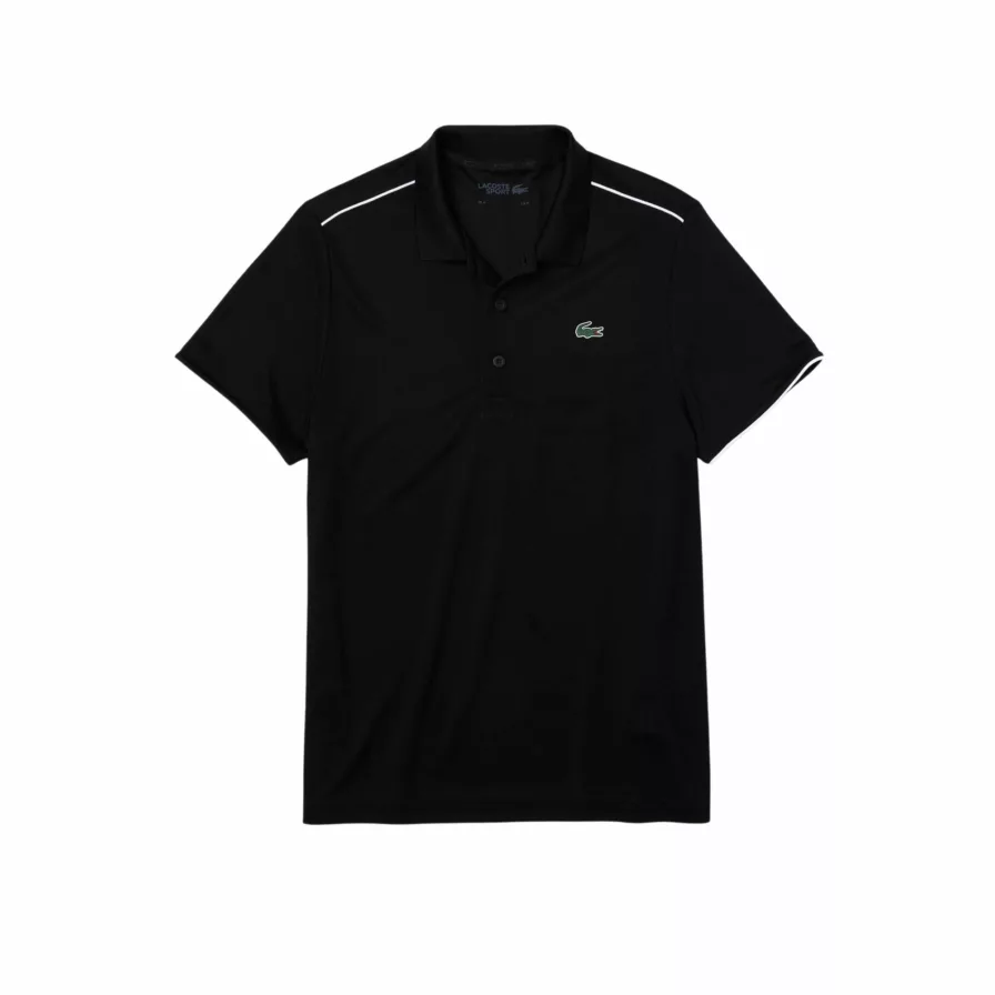 Lacoste Sport Breathable Piqué Polo kommer i en stilren sort farve med fede hvide detaljer på ærmerne.