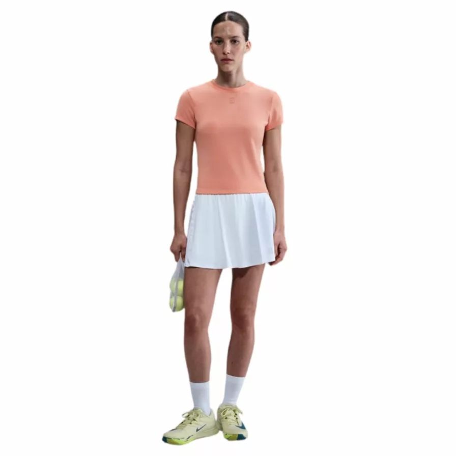 Denne tætsiddende tennis t-shirt er fremstillet i blødt, ribbet materiale med Dri-FIT, der gør trøjen åndbar og hurtigtørrende. Til sidst, så kommer den i en frisk ferskenfarve.