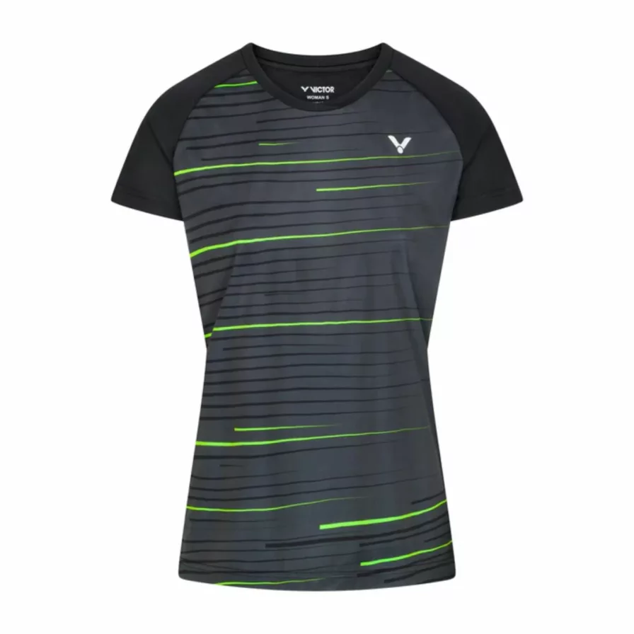 Badminton t-shirt i højkvalitetsmaterialer. T-shirten er lavet i et elastisk og åndbart materiale. T-shirten er samtidig meget let i stoffet og er svedabsorberende. T-shirten er i sort med grå front med et grønt mønster.